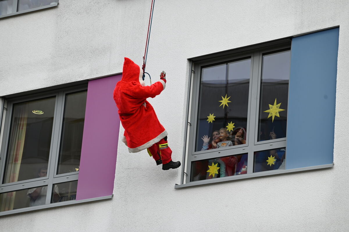 Verkleidet als Weihnachtsmann seilt sich ein Höhenretter winkend am Klinikum am Steinenberg ab.