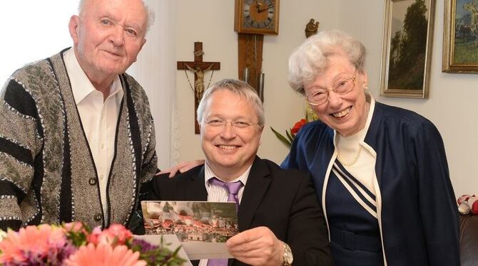 Bürgermeister Robert Hahn verliest Glückwünsche von Oberbürgermeisterin Barbara Bosch. Elise Lotte Schäfer und ihr Mann Willi Erich freuen sich.