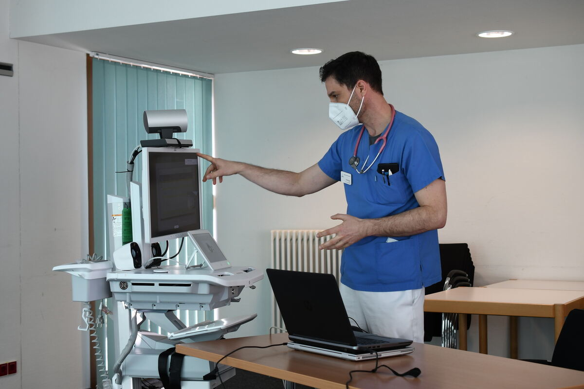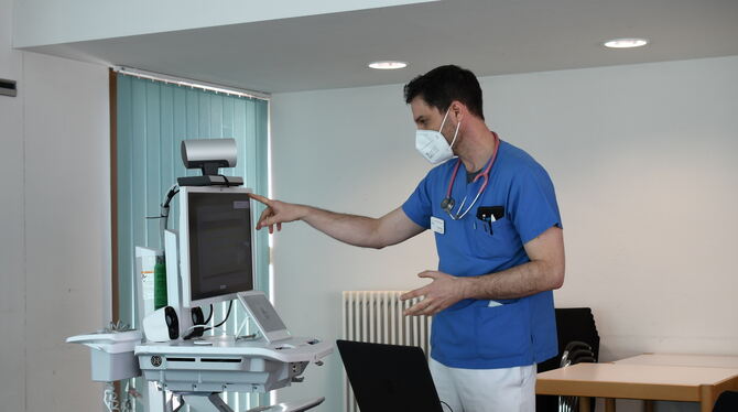 Berühren kann Oberarzt Thomas Rabe den Patienten durch den Videobildschirm nicht, aber mit seinen Kollegen via Telemedizin besprechen, wie ihm zu helfen ist.