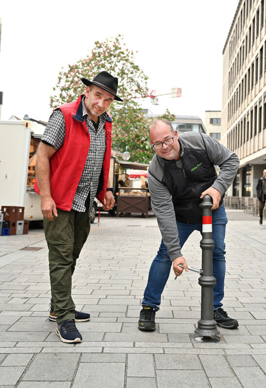 Fürs Foto im nachgestellten Einsatz: Die beiden Marktmeister Frank Kuhn (links) und Martin Frech zeigen, was sie normalerweise in aller Herrgottsfrüh erledigen – zum Beispiel Absperrpfosten montieren. FOTO: PIETH