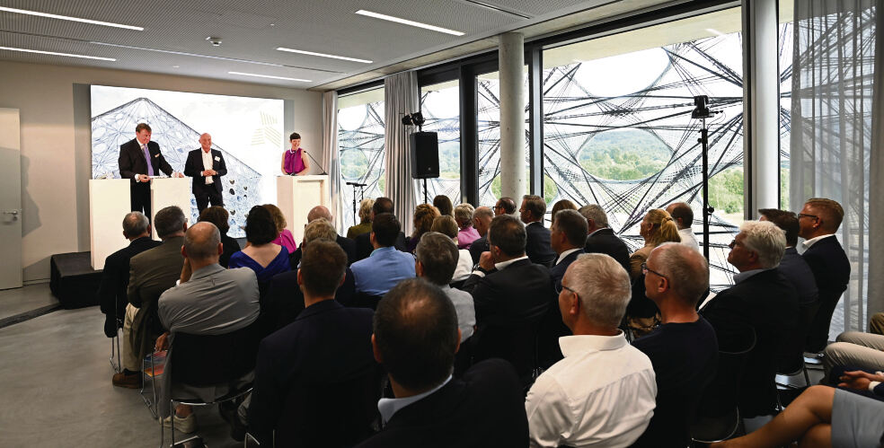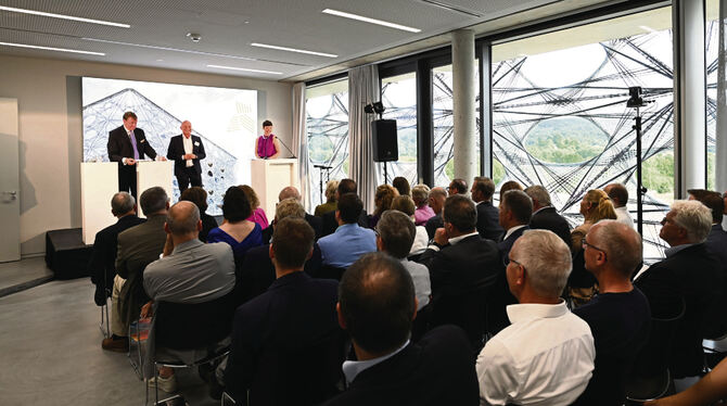 Beachtliche 19 Namen hat die Moderatorin auf ihrer Liste. In einer der oberen Etagen des strahlenden Treffpunktes von Studierenden und Industrie haben sich etwa Wirtschaftsministerin Dr. Nicole Hoffmeister-Kraut, diverse Landtagsabgeordnete sowie Oberbürgermeister Thomas Keck und Finanzbürgermeister Roland Wintzen versammelt. Als erster Redner spricht Hausherr Bodo Bölzle, der Präsident von Südwestmetall. Dem Arbeitgeberverband verdankt die Hochschule den mit Technik und Labors vollgestopften Bau mit seiner einzigartigen Fassade aus Stoff-Elementen.
