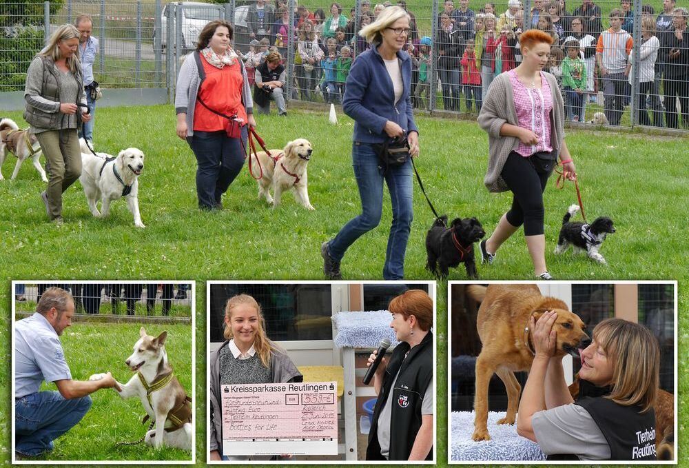 Fest-Aspekte: Beeindruckend gut erzogene Hunde bei der Vorführung der Hundeschule (oben und links unten), ein Spendenscheck von Abiturientin Alice Degelow für die Vereinsvorsitzende Birgit Jahn und ein Küsschen von Zack für seine Betreuerin. FOTO-MONTAGE: SCHÄLE-SCHMITT