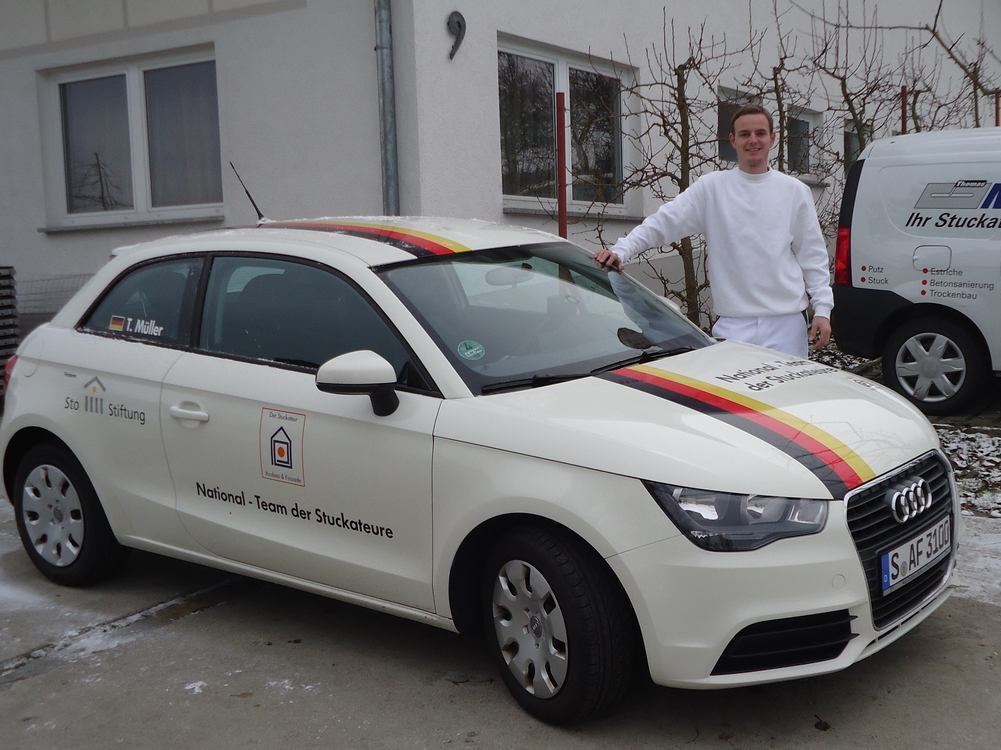 Timo Müller ist stolz auf sein »Dienstfahrzeug«, das er als Teammitglied der Stuckateur-Nationalmannschaft für zwei Jahre bekommen hat. FOTO: PR