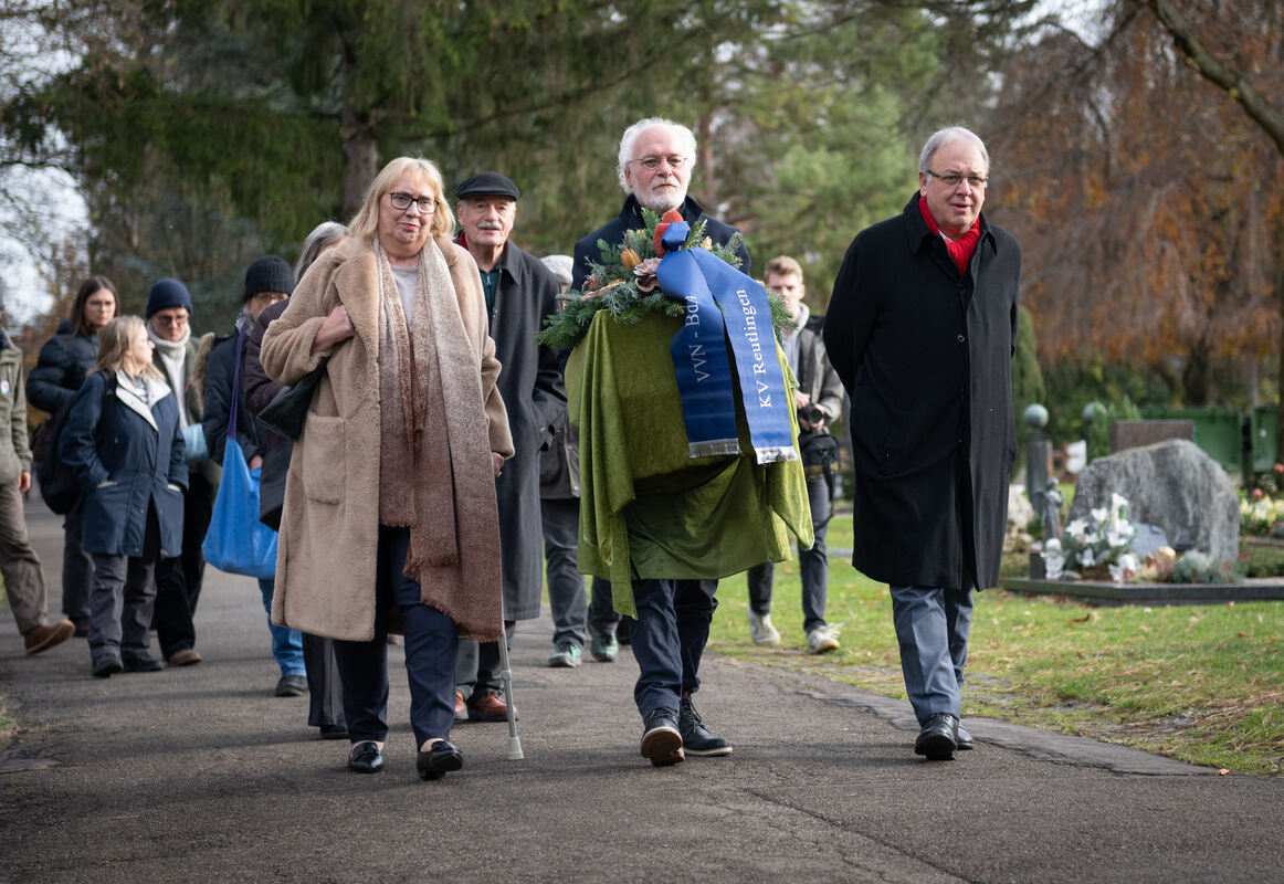 Auch der Reutlinger Oberbürgermeister Thomas Keck lauschte den durchaus umstrittenen Thesen der Hauptrednerin zum Ukraine-Krieg und schritt dann zur Kranzniederlegung neben Thomas Ziegler – der ehemalige Reutlinger Stadt- und Kreisrat leitete als Kreisvorstand der VVN-BdA die Gedenkfeier. (eg/igl)