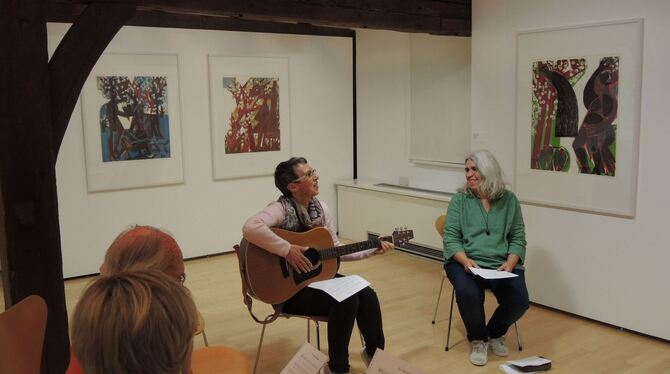 Die Stimmung in der Grieshaber-Etage des Spendhauses ist an diesem Nachmittag fröhlich, ja beinahe ausgelassen. Die Kaffeerunde ist in vollem Gange. Die Gäste, das sind Menschen mit einer Demenzerkrankung und ihre Begleiter, machen sich in dieser gemütlichen Atmosphäre miteinander vertraut. Silvia Phleps von der DRK-Alzheimerberatung greift nach ihrer Gitarre und intoniert die ersten Akkorde eines Frühlingsliedes.