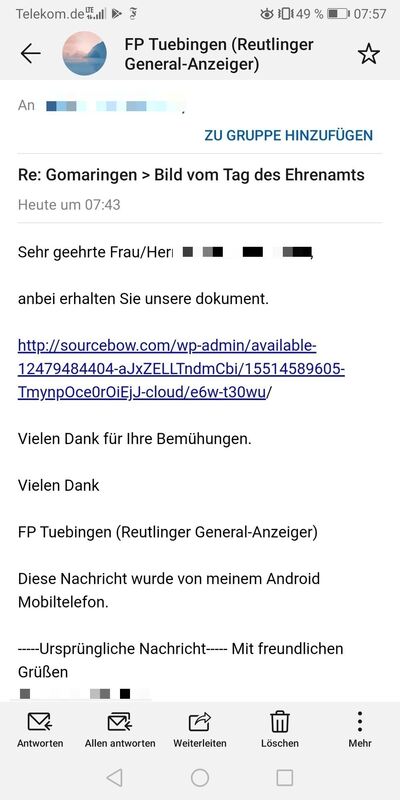 REUTLINGEN. Eine Welle gefälschter E-Mails schwappt aktuell durchs Internet. Schuld ist der Trojaner Emotet. Er »gilt als eine der größten Bedrohungen durch Schadsoftware weltweit«, schreibt das Bundesamt für Sicherheit in der Informationstechnik. Der Reutlinger General-Anzeiger ist zwar nicht infiziert, ist aber doch von den Auswirkungen betroffen. So werden seit gestern von gefälschten Adressen Mails mit den Absendern Andreas Dörr oder FP Tuebingen versendet. Sie enthalten Links oder Anhänge, die, wenn sie angeklickt werden, den Computer mit dem Trojaner infizieren.