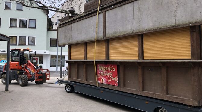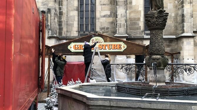 REUTLINGEN. An dem Tag, an dem Ministerpräsident Winfried Kretschmann die Corona-Alarmstufe für Baden-Württemberg ausgerufen hat, ist in Reutlingen der Aufbau des Weihnachtsmarktes angelaufen. Dieser soll vom 24. November bis zum 21. Dezember an mehreren Orten verteilt in der Innenstadt stattfinden. Vor der Marienkirche am Kirchenbrunnen haben am Dienstagmittag mehrere Personen eine Holzhütte aufgebaut, die laut Beschilderung eine Grill-Hütte werden soll. Mehrere Lkw lieferten am Weibermarkt das Baumaterial dafür an.