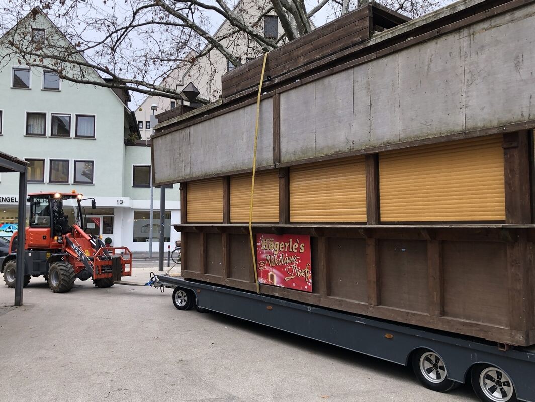 Auch am Albtorplatz sind bereits die ersten Buden zu sehen. Die größte, mehr als fünf Meter lange Hütte, wurde auf einem Anhänger von einem Gabelstapler auf den vorbestimmten Platz geschoben. Der Fahrer brauchte dafür mehrere Anläufe, da das Gespann zwischen dem Bushaltestellen-Wartehäuschen und einem Baum nur wenige Zentimeter Spiel hatte.