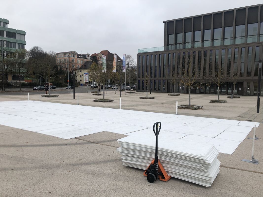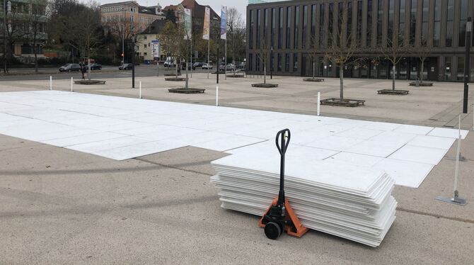 Ein erster Vorbote des Weihnachtsmarktes ist ebenso an der Stadthalle zu sehen. Ein Team der Reutlinger Eishalle legte vor dem Haupteingang Platten für eine Bahn aus Kunsteis aus. Vom Riesenrad, das der anderen Seite der Stadthalle ein Highlight werden soll, war am Dienstagmittag noch nichts zu sehen. Das Fahrgeschäft lagert auf mehrere Lkw verteilt noch am Kreuzeiche-Stadion.