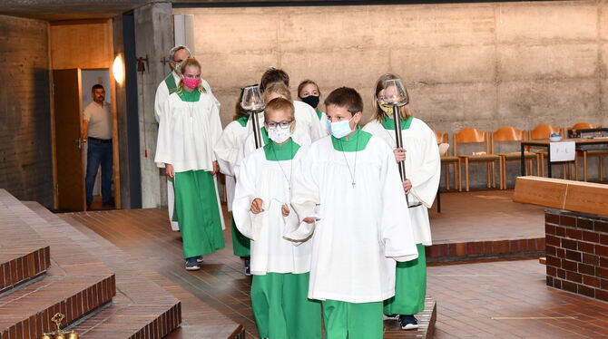 REUTLINGEN. Gottesdienste sind in Reutlingen seit sechs Wochen wieder eingeschränkt möglich. Auch der Dienst der Ministranten der katholischen Kirche kann weitergehen, ist durch Corona aber erheblich eingeschränkt. Dabei ist in der Seelsorgeeinheit Reutlingen Nord die Zahl der Mädchen und Jungen, die dem Priester beim Gottesdienst helfen, so hoch wie nie. 2019 haben sich von den Kommunionkindern aus Pliezhausen, Mittelstadt und Orschel-Hagen 20 als Ministranten angemeldet und eine Ernennungsurkunde erhalten. Damit stieg die Gesamtzahl auf 59.