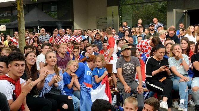 Mit Dejan haben vor der Markthalle in der Reutlinger Innenstadt rund 1 300 Fußball-Fans gefiebert. Rot-weiß-karierte Trikots, wo man auch hingeschaut hat. Bis zur 19. Minute sah es fast so aus, als ob hier überhaupt keiner die Équipe Tricolore unterstützt. Erst als Mario Mandzukic den Ball zum 1:0 für die Franzosen ins eigene Tor lenkte, verriet verhaltener Torjubel, wo sich die Anhänger des neuen Weltmeisters versteckten.