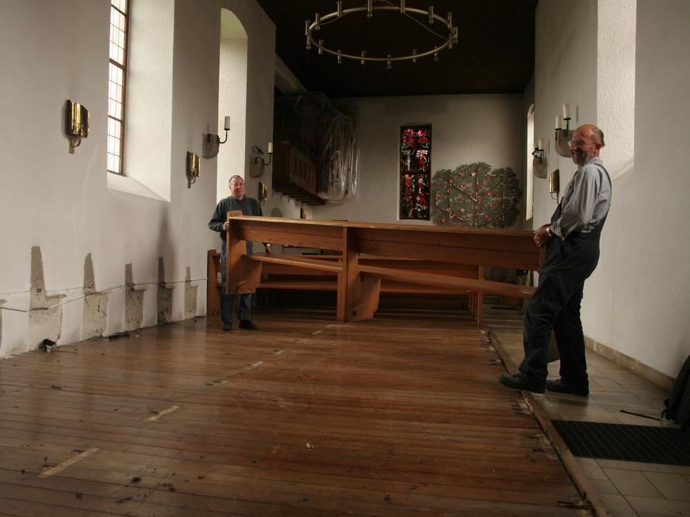Norbert Speck (links) und Reiner Zeeb wuchten Kirchenbank um Kirchenbank ins Freie. GEA-
