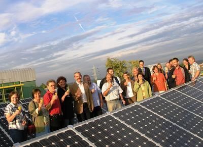 Der Schule aufs Dach gestiegen und auf die neue Solaranlage angestoßen: »Einspeisefest« auf dem BZN.
