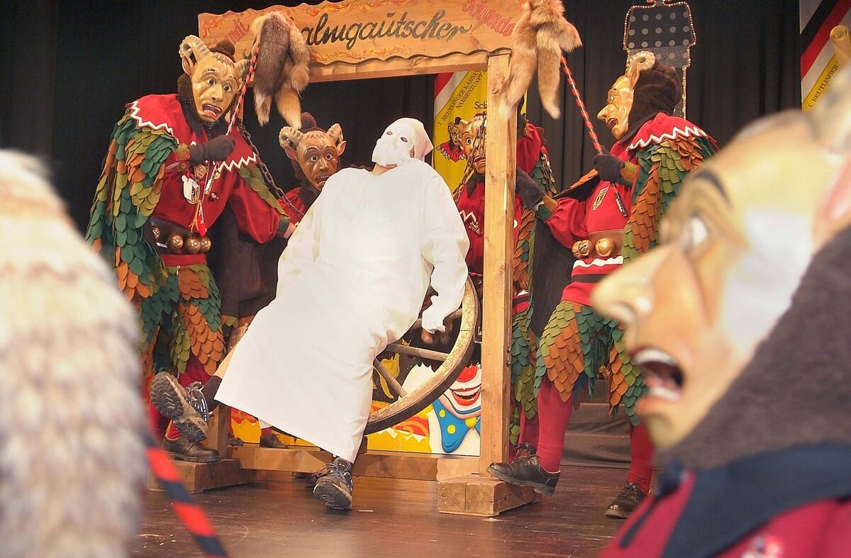 Letzteres kostet vier Euro Eintritt. Wobei Kinder bis einschließlich zwölf Jahren kostenlos willkommen sind. Statt Tickets erhalten Zuschauer wieder Pappkrawatten, auf denen die Namen der teilnehmenden Gruppen in der Reihenfolge ihres Aufmarschs notiert stehen – inklusive der ihnen eigenen Narrenrufe. Damit das Publikum die Gäste – die weitgereistesten kommen aus Eggingen an der Schweizer Grenze, aus Neresheim und Aalen-Wasseralfingen sowie aus der Kurpfalz und aus Bayern – korrekt und gerne auch lautstark begrüßen kann.