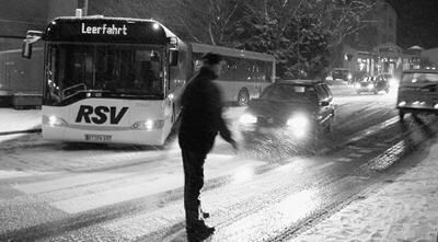 Blockierte gestern Abend in Höhe der Silberbar den Verkehr - ein RSV-Gelenkbus, der die Steinenbergstraße herunter ins »Trudeln« gekommen war und nur mühsam die Kurve in die Georgenstraße geschafft hatte.