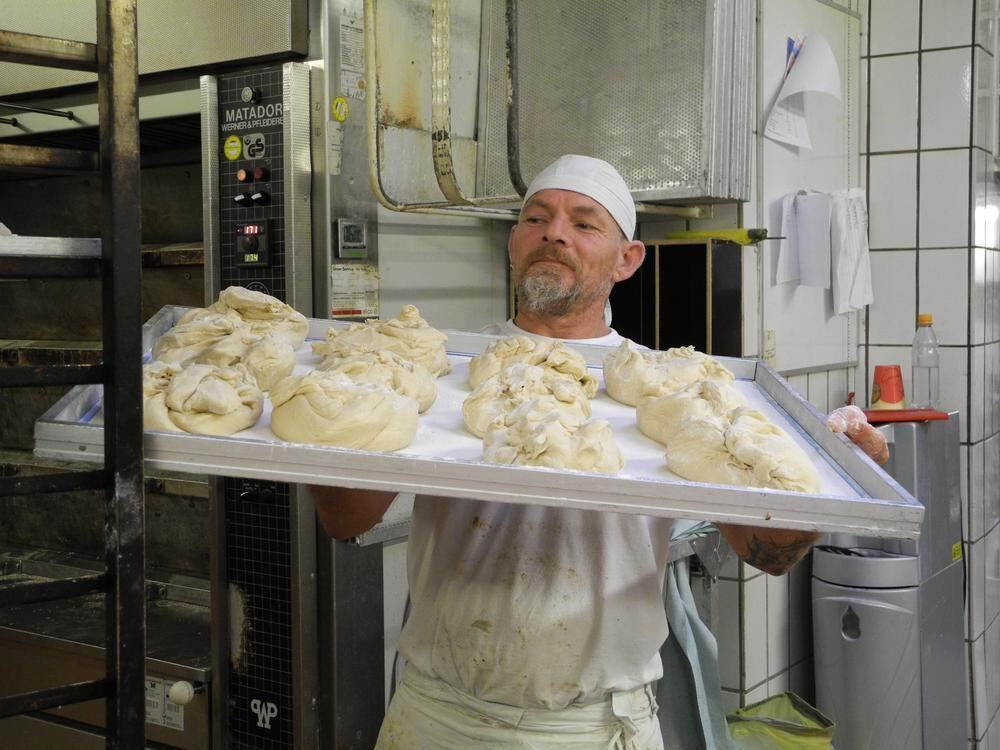 Bäckermeister Thomas Zinser schiebt ein Blech in den Rollwagen.