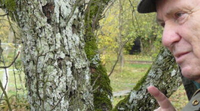 Den grünlich-grauen Flechtenbelag, in gesundem Zustand Zeuge für gute Luft, erforscht Werner Grüninger seit über 30 Jahren.