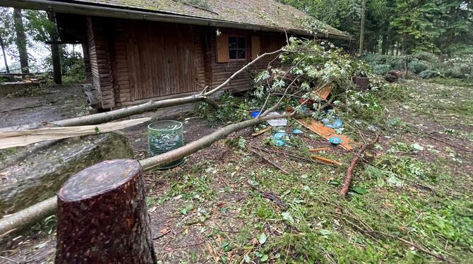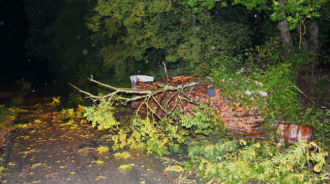 REUTLINGEN. Gegen 21.15 Uhr zog ein kurzes, aber heftiges Unwetter mit starken Windböen über die Landkreise Reutlingen, Tübingen und den Zollernalbkreis hinweg. Von Westen her kommend entlud es sich mit orkanartigen Windböen. In Hechingen hat das Unwetter ein Todesopfer gefordert. Bei einem tragischen Unglücksfall hat ein Mann sein Leben verloren, berichtet die Polizei. Der 62-Jährige zeltete alleine an einem freistehenden Baum zwischen Hechingen und dem Stadtteil Stetten. Während des Gewitters wurde durch den Sturm ein Teil des Baumes entwurzelt und stürzte auf das Zelt, in dem sich der Mann befand. Eine Fußgängerin fand am Freitagmorgen, kurz vor 9.30 Uhr, den Leichnam und verständigte die Polizei. Zur Unterstützung war die Feuerwehr mit an die Unglücksstelle ausgerückt.
