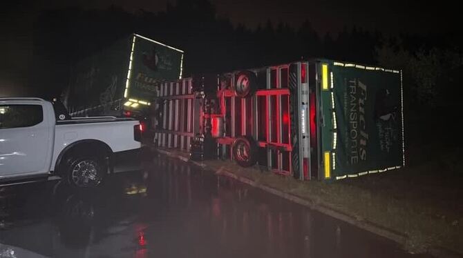 Auf einem Parkplatz entlang der B312 bei Engstingen stürzte gegen 21.40 Uhr der Anhänger eines geparkten Lkw durch den Wind um. Der sich zu diesem Zeitpunkt in der Kabine befindliche Fahrer blieb unverletzt. Die Schadenshöhe kann noch nicht abgeschätzt werden, dürfte sich jedoch auf mehrere tausend Euro belaufen.