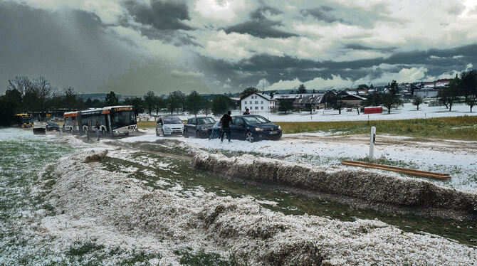 Prekär war die Situation in Kusterdingen. Zeitweise war der Ort nur noch über Jettenburg erreichbar. Die Mannschaft der Freiwilligen Feuerwehr musste zu 18 Einsätzen ausrücken. Zwei davon waren besonders ungewöhnlich. »Der Keller einer alten Fabrik und einer Kellerwohnung waren mit Hagel gefüllt«, berichtet der Kommandant der Freiwillingen Feuerwehr in Kusterdingen, Frank Ott. Die Hagelmassen hatten durch die Wohnungseingangstür von außen in die Wohnung gedrückt und standen 150 Zentimeter hoch in den Wohnräumen. »Die Familie hat uns das sehr dramatisch geschildert. Sie hatte großes Glück, dass sie das Haus sicher verlassen konnte«, sagt Ott. Von 19 bis 5 Uhr versuchten die Einsatzkräfte die Wohnung von den Hagelmassen zu befreien – ohne Erfolg. Noch immer sind die Körner in der Wohnung. »Der Eigentümer muss den Schaden jetzt an die Versicherung weitergeben«, sagte Ott am Donnerstagnachmittag. »In mehr als 30 Jahren bei der Feuerwehr habe ich so etwas nicht erlebt«, sagt Ott. Sogar das THW kam zur Hilfe.