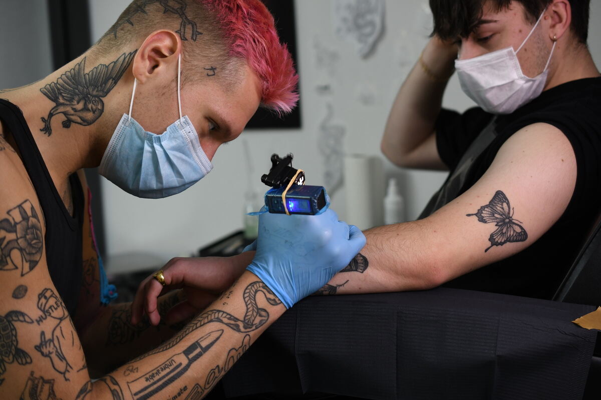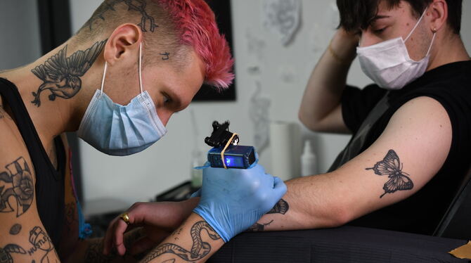 Tätowierer Jan Sabieraj (links) aus dem Tattoo-Studio »Room26« in Reutlingen muss bei der Arbeit erstmal auf Farben verzichten.