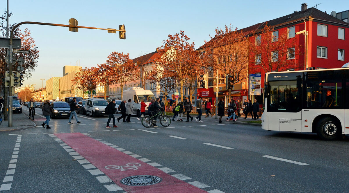Wer bekommt wie viel Raum? Der ökologische Verkehrsclub VDC Reutlingen, BUND, der Fahrrad-Club ADFC und Ökostadt Reutlingen haben einen externen Experten eingeladen, einen Blick auf Reutlinger Verhältnisse zu werfen (im Bild die Karlstraße). FOTO: NIETHAMMER