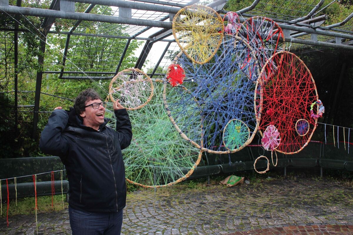 Dabei entstanden aus Stoff geflechtete und aus Ton und Gips modellierte Installationen, eine blaue Bildergalerie, Strickanzüge für Bäume und fliegende Delphin- und Vogelschwärme, die im Glashaus und im Park ausgestellt und von den Künstlern erläutert wurden. (GEA)