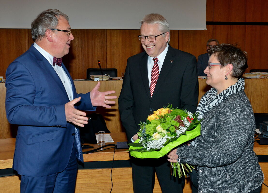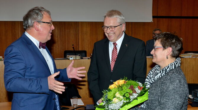 Erwartungsgemäß hat der Gemeinderat gestern Abend Robert Hahn für weitere acht Jahre in seinem Amt als Verwaltungsbürgermeister bestätigt. Der 57-Jährige war dem Gremium als einziger Kandidat vorgeschlagen worden, 35 Räte stimmten in geheimer Wahl für den gebürtigen Pforzheimer, vier Stimmzettel waren ungültig. Als »hauptamtlicher Beigeordneter für den Geschäftskreis Verwaltungsdezernat«, wie die Position offiziell heißt, ist der Christdemokrat unter anderem für Hauptamt, Bürgeramt, Kulturamt, das Amt für Jugend, Schulen und Sport sowie das Sozialamt zuständig. Oberbürgermeister Thomas Keck (links) gratulierte seinem wiedergewählten Dezernenten, im Bild mit seiner Frau Franziska. (GEA)