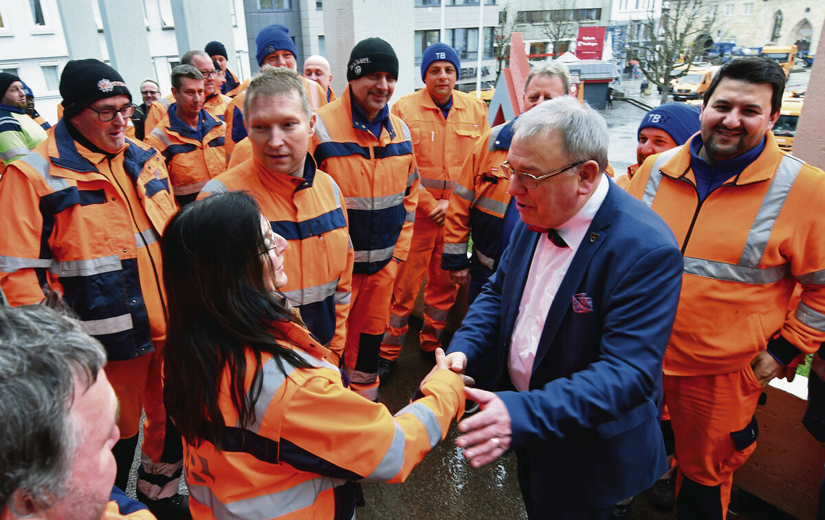 Die technischen Betriebsdienste rückten mit ihrer beeindruckenden Fahrzeugflotte an. Auch als sozialdemokratisches Oberhaupt einer Groß- und zugleich Kreisstadt ist sein Fachgenossen- und Freundeskreis entsprechend groß. Deshalb machten von elf Uhr an Vertreter aus Behörden und der Politik, der Vereine, ebenso aus Industrie und Wirtschaft ihre Aufwartung, Regierungspräsident Klaus Tappeser vorneweg, kleine Geschenke und launige Reden im Gepäck.