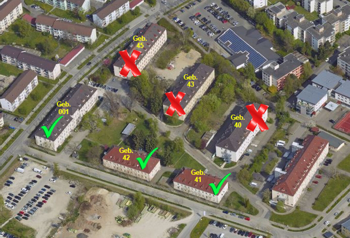 Drei Kasernengebäude sollen abgerissen werden, drei sollen stehen bleiben. GRAFIK: STADT