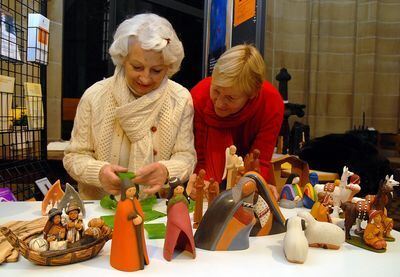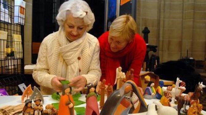 Heike Gauermann (links) und Mex Heinz beim Aufbauen einer peruanischen Krippe. Von heute bis zum 19. Dezember sind über 100 Krippen ausgestellt. GEA-FOTO: PACHER