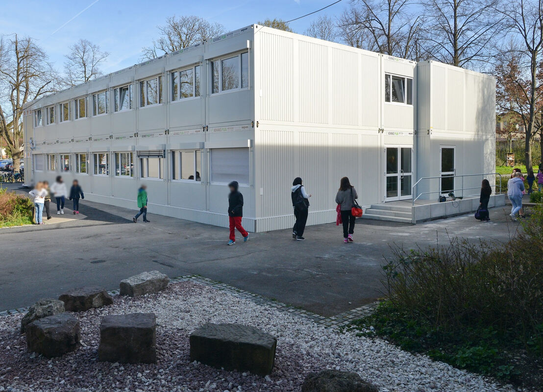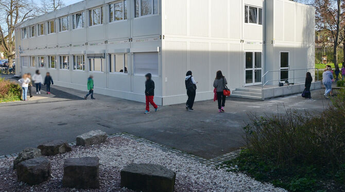 Inzwischen sind die Container auf dem Betzinger Schulgelände zwar geleert, doch sie bleiben als Reserve vorerst stehen. FOTO: NIETHAMMER