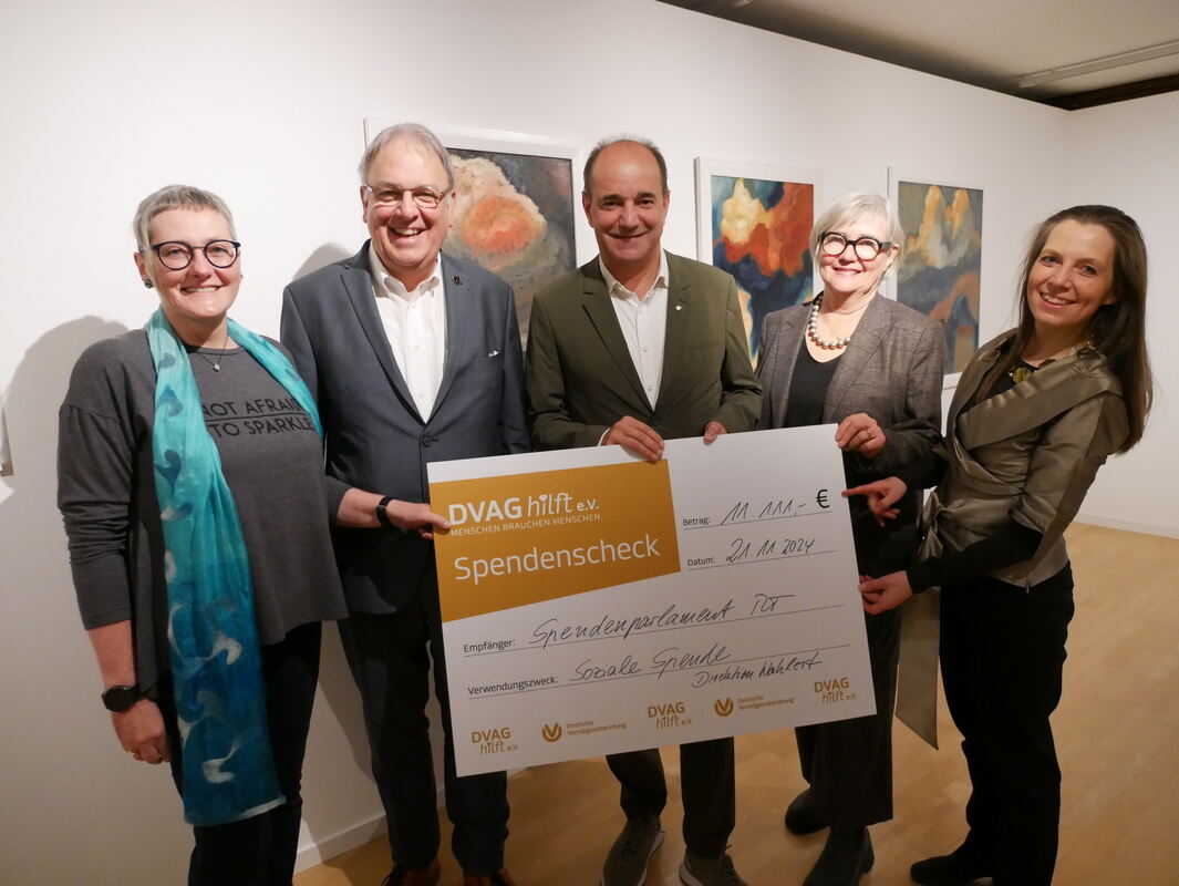 Sie freuen sich über vergangene 50 Sitzungen und einen dicken Scheck an das Spendenparlament: (von links) Ute Steinbrück, OB Thomas Keck, Jörg Wahlert von der Deutschen Vermögensberatung, Christiane Koester-Wagner und Charlotte Fliedner.