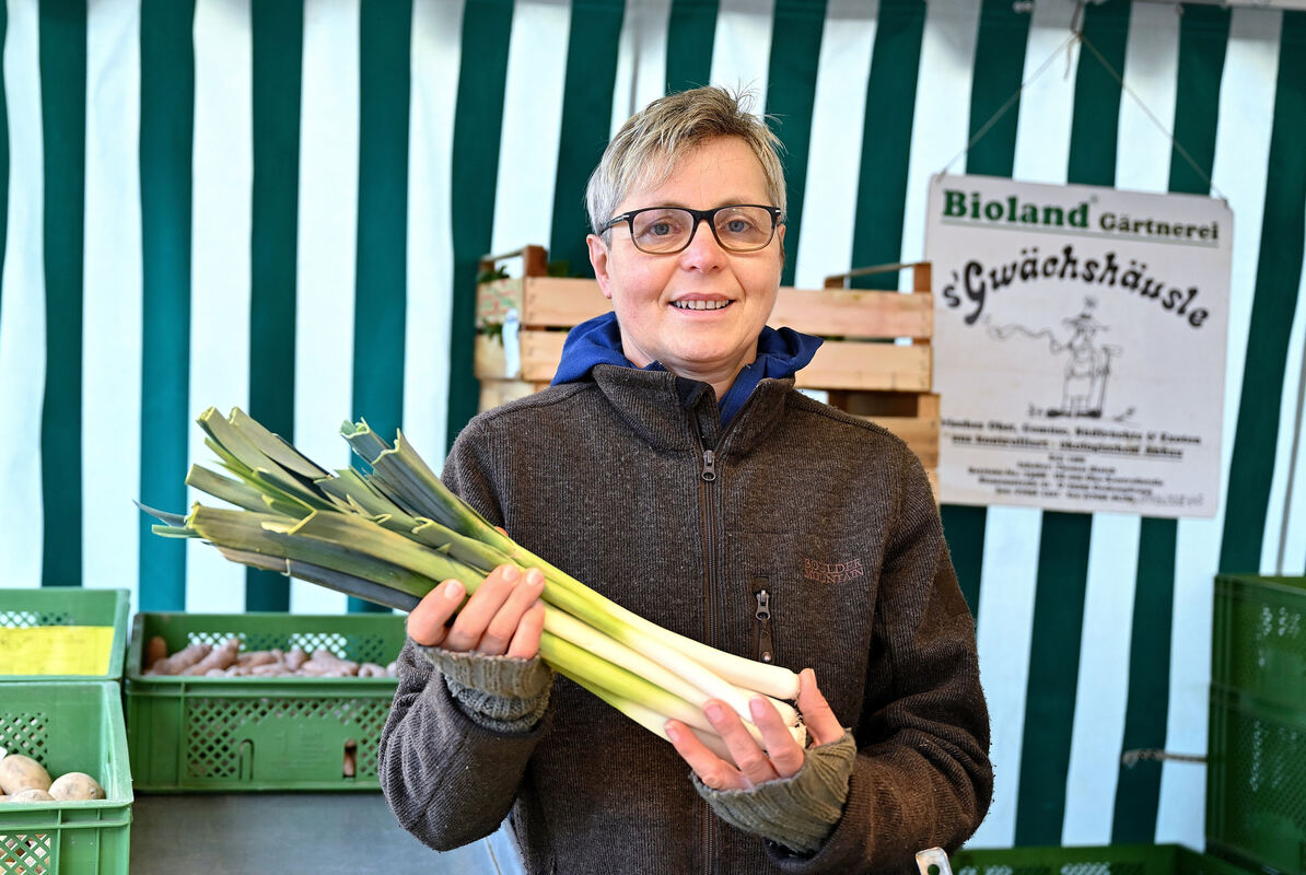 Hat auch Porree in ihrem Bioland-Sortiment: Marktbeschickerin Regina Schuler. FOTO: PIETH