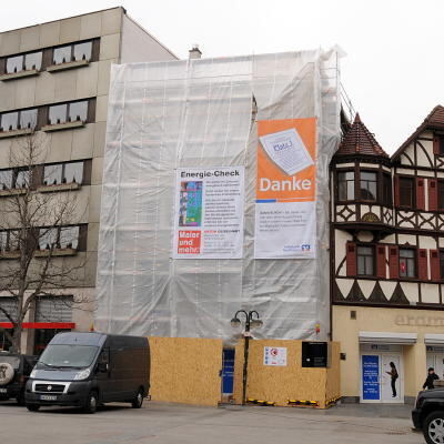 Bald fällt der Vorhang: Die Arbeiten im Inneren des Gebäudes Marktplatz 4 laufen auf Hochtouren, nach Ostern wird die neue Volksbank-Filiale eröffnet.