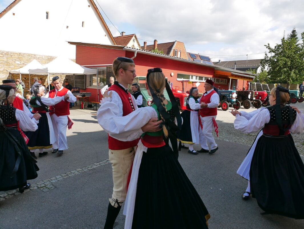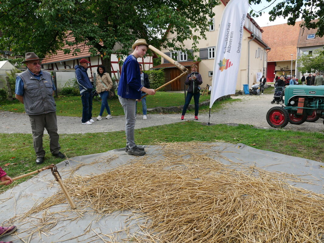 Tim Zössmayr zeigte mit seinen gerade mal 17 Jahren sehr gekonnt, wie das Dreschen funktioniert – wer wollte, konnte es unter Anleitung dann auch gleich selbst probieren. »Früher hat man das nicht nur zwei Minuten gemacht, sondern den ganzen Tag«, sagte ein fachkundiger Beobachter. Schwäbische Leckereien gab es zu essen und überlieferte Tänze von der Volkstanzgruppe des Schwäbischen Albvereins der Ortsgruppe Betzingen in ortstypischer Tracht zu bestaunen. Alles gemütlich, familiär, gesellig. (GEA)