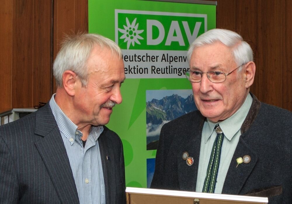 Helmut Kober, Erster Vorsitzender der Reutlinger DAV, verlieh Rolf Weinmann die Ehrenmitgliedschaft der Sektion. FOTO: DAV