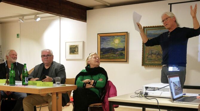Lutz Adam vom Stadtjugendring (rechts) stand für eins von elf Projekten, die vom Reutlinger Spendenparlament unterstützt werden wollten, das Präsidum des Parlaments schaute zustimmend, (von links: Günter Klinger, Heinz Gerstlauer und Dr. Barbara Dürr).