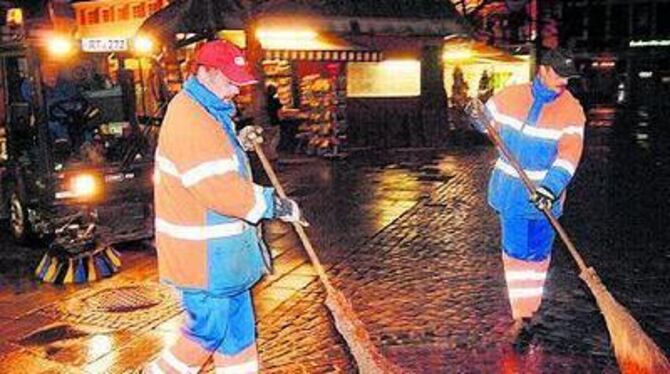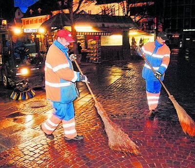 Vorarbeiter für Kehrmaschinenfahrer Klaus Bader: Kurt Czegley (rechts) und Wolfgang Laemchen beim Fegen des Marktplatzes.