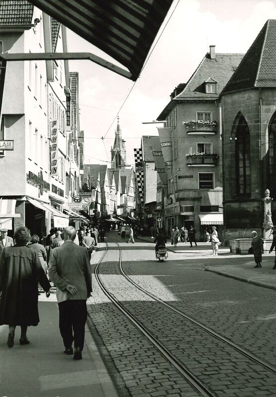 Die untere Wilhelmstraße um 1955: Damals fuhren Autos, Mopeds und die Straßenbahn über die Wilhelmstraße. FOTO: DOHM/HEIMATMUSEUM