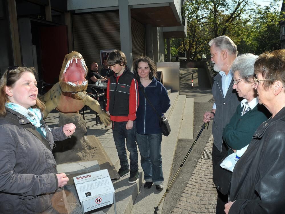 Dino-Führung mit wissenschaftlichem Anspruch: Diplom-Biologin Barbara Kagerer mit GEA-Lesern beim Nothosaurus, einem ans Leben im Wasser angepassten Saurier, dessen lebensgroßes Modell vor dem »Joli« in der Rathausstraße steht.