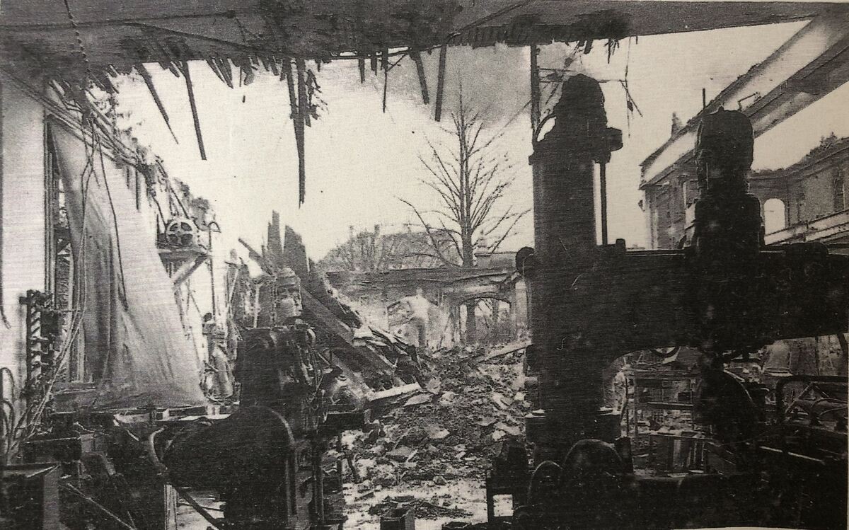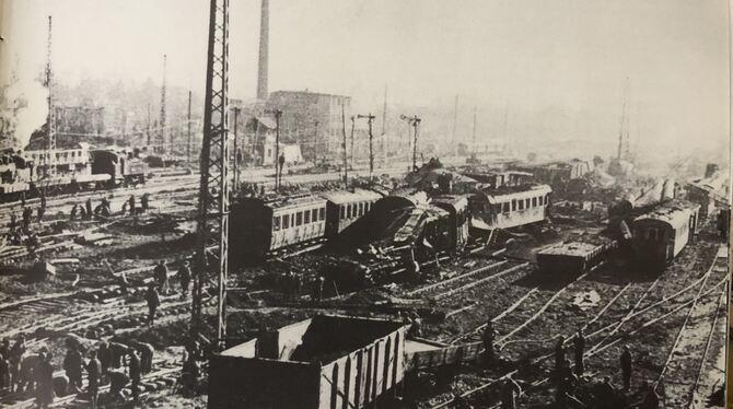 Der Reutlinger Güterbahnhof am 15. Januar 1945 nach dem ersten schweren Luftangriff der alliierten Streitkräfte drei Monate vor Ende des Zweiten Weltkriegs.