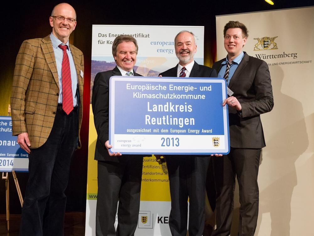 Gute Laune bei der Preisverleihung (von links): Erster Landesbeamter Hans-Jürgen Stede, Umweltminister Franz Untersteller, Landrat Thomas Reumann und der eea-Koordinator Friedrich Huster. FOTO: PR