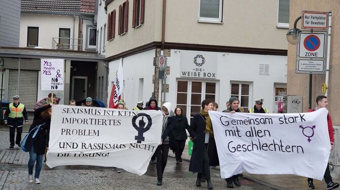 Bei nasskaltem Wetter: Demonstrationszug und Kundgebung für die Rechte der Frauen und gegen jedwede Diskriminierung.