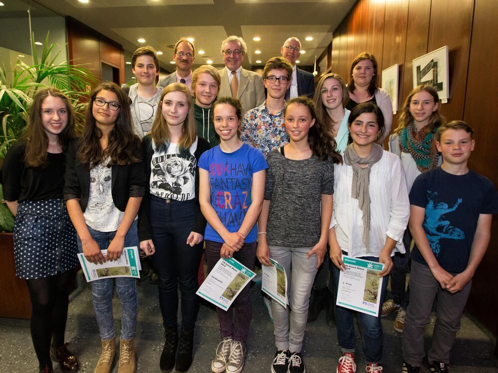 Preisträger und Laudatoren in der Schalterhalle der Reutlinger Volksbank in der Gartenstraße.