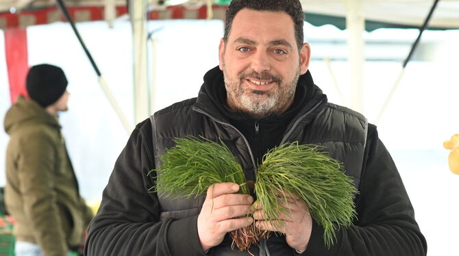 Wildwüchsig und gesund: Was Marktbeschicker Domenico Arcuri hier in Händen hält, nennt sich Mönchsbart und erobert allmählich auch die deutschen Küchen.