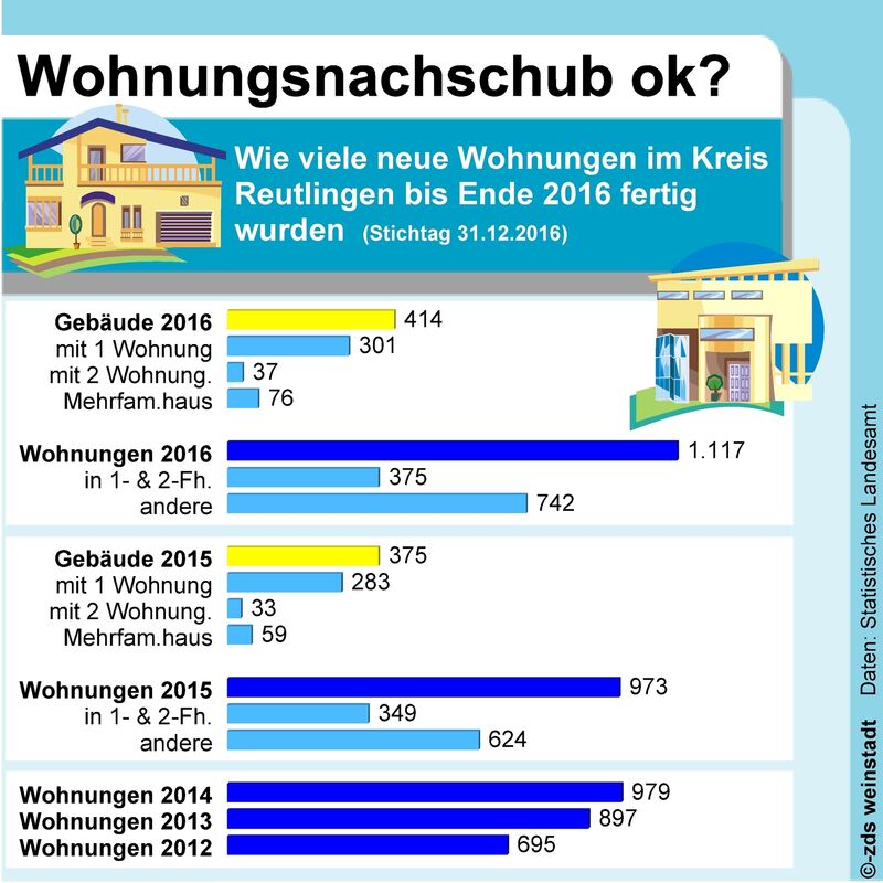 Der Kreis Reutlingen gehört dabei zu den Bereichen in Deutschland, die bei neuen Wohnungen im Plus sind: Mit 1 117 fertiggestellten Wohnungen wurden hier 144 Wohnungen mehr bezugsfertig als ein Jahr zuvor. Ein Jahr weiter zurück, im Jahr 2014, registrierte die Baustatistik 979 neue Wohnungen. Zum Vergleich: Im deutschlandweiten Spitzenjahr 1995 lag die Zahl der fertiggestellten Wohnungen bei uns bei 2 447.