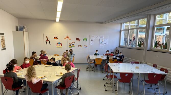 Die Nachfrage ist groß, die »Mensa« der Waldschule Ohmenhausen viel zu klein: Sie bietet nur Platz für 32 Schüler. Gegessen wird in drei Schichten und sogar auf dem Flur. Normalerweise ist es voller als auf dem Foto, einige Schüler fehlen wegen Quarantäne. FOTO: SCHULE
