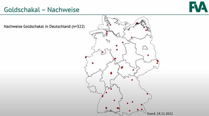 Wildtierexperte Felix Böcker von der FVA geht im Gespräch mit dem GEA davon aus, dass dieses Tier auf der Durchreise war. Er will explizit nicht ausschließen, dass Goldschakale mittlerweile erneut in den Kreis Reutlingen eingewandert sind, nur niemanden aufgefallen und in keine Fotofalle getappt sind. »Die Ausbreitung geht recht schnell. Im Jahr 2019 gab es noch keine Goldschakale hier, jetzt werden es immer mehr«, so Böcker. In ganz Deutschland gab es vor fast genau einem Jahr mehr als 320 Nachweise von Goldschakalen.