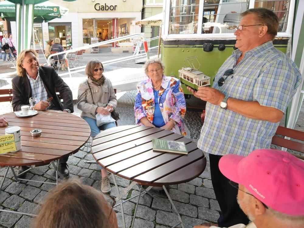 Kleine, aber feine Gesprächsrunde beim »Schwätzle-Eck«: Wolf Rüdiger Gassmann (stehend) teilt sein Straßenbahn-Fachwissen mit den Zuhörern.
